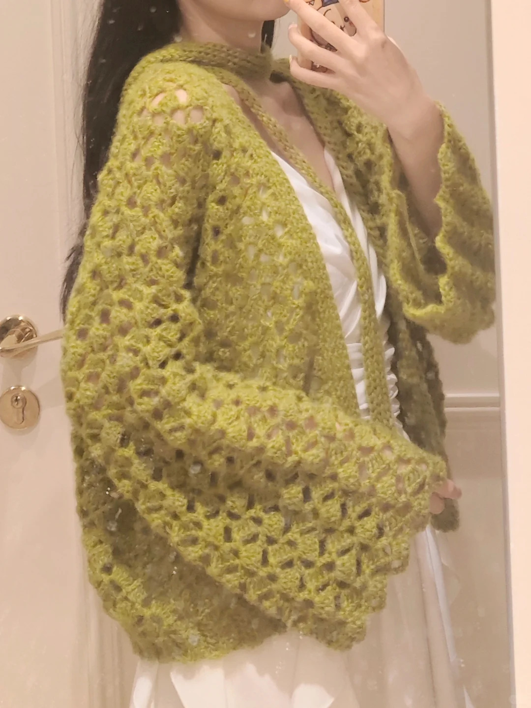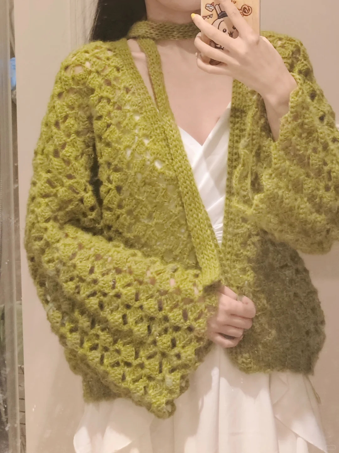 求1-17行:不加不减钩27组花随后到袖子位置开始分片钩织27组分为6(左前)+15(后)+6(右前)18-28行:三片分别不加不减钩11行(袖高)完成后缝合肩线6组花,断线此时后片处空15-6-6=3组花为后领口