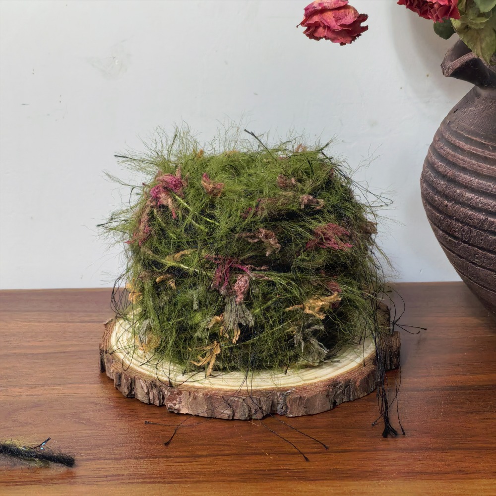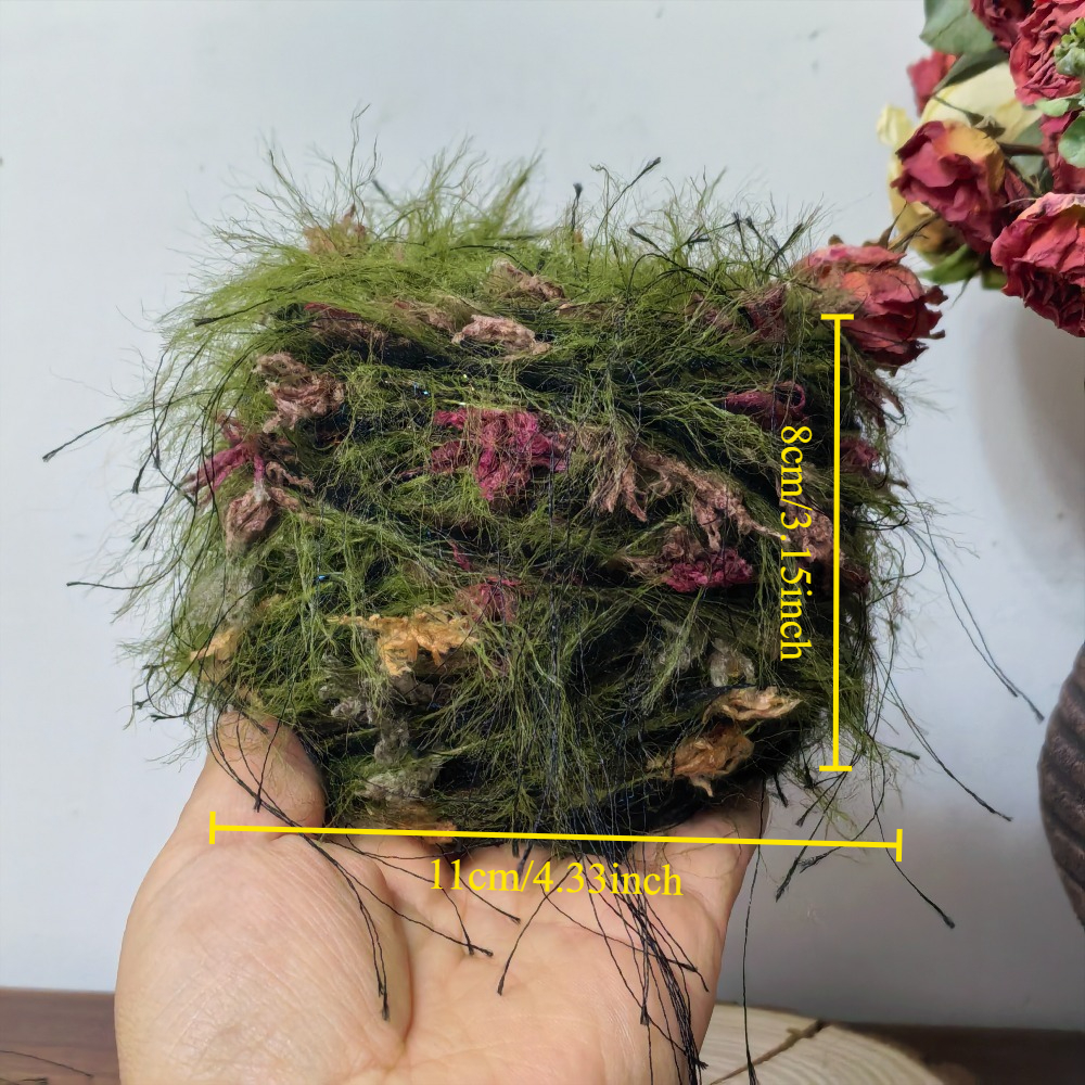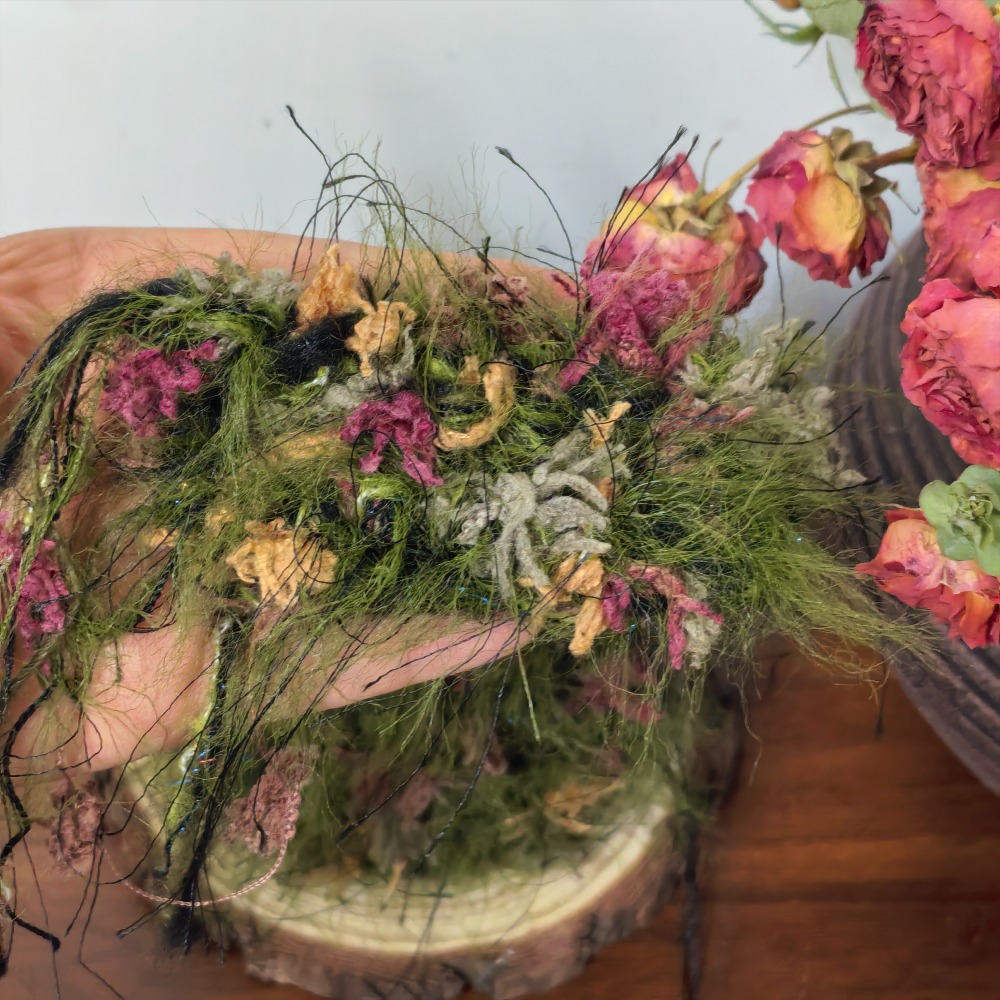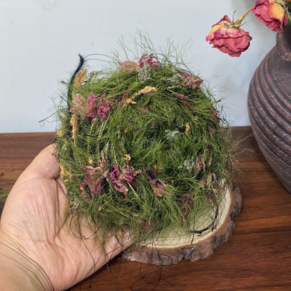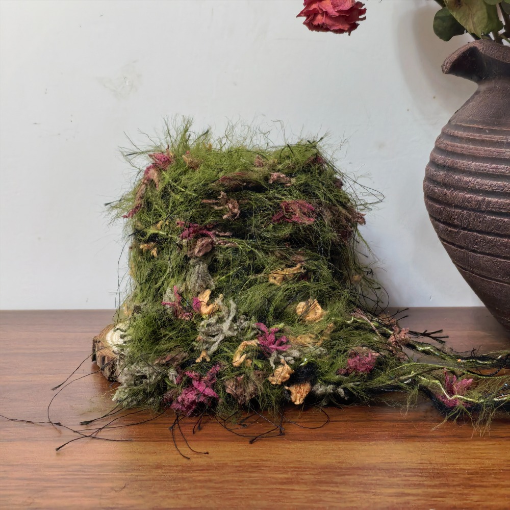 نخ مخلوط دستی سبز خزه ای، توری گلدار مخملی، روکش فنجان قلاب بافی، کیف گوشی، سیم دستباف به سبک دختر جنگلی