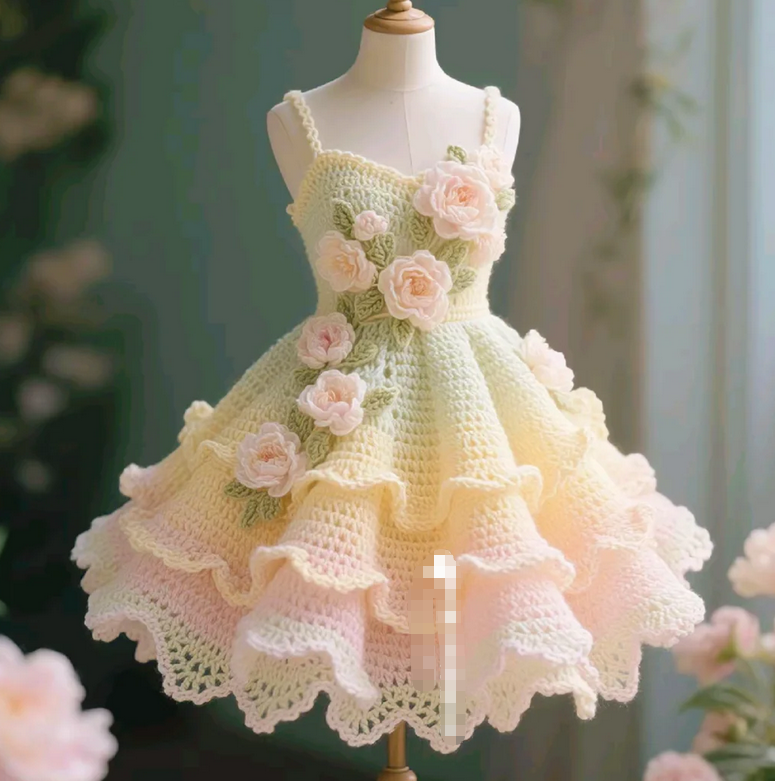 ・身頃部分:前身頃と後身頃を別々に編みます。身頃部分は5段ごとにステッチを入れます。 1回に加える編み目の数は現在の段数の1/5で、徐々にスカートが大きくなっていきます。裾の長さが希望のサイズになるまでかぎ針編みします。